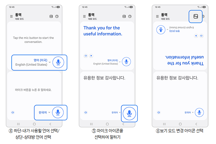- 이어폰/갤럭시 버즈 연결 → 상대방에게 번역된 음성을 바로 들려줄 수 있음