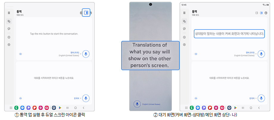 - 갤럭시 Z 폴드, 갤럭시 탭 등 대화형 화면에서 양쪽에 원문과 번역문을 동시에 표시 가능