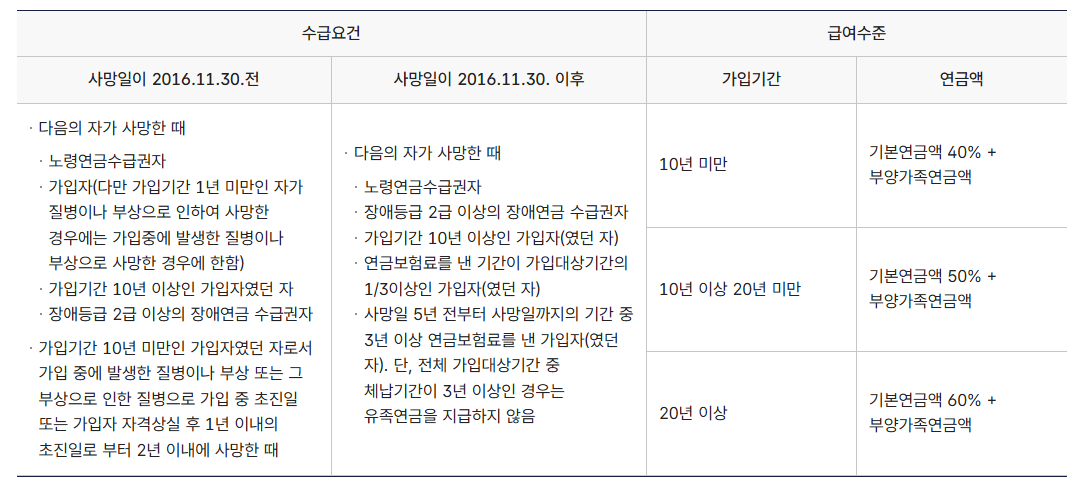 | 대상 | 가입자·수급자의 유족 | 일정 가입 요건 미달 가입자의 유족 |