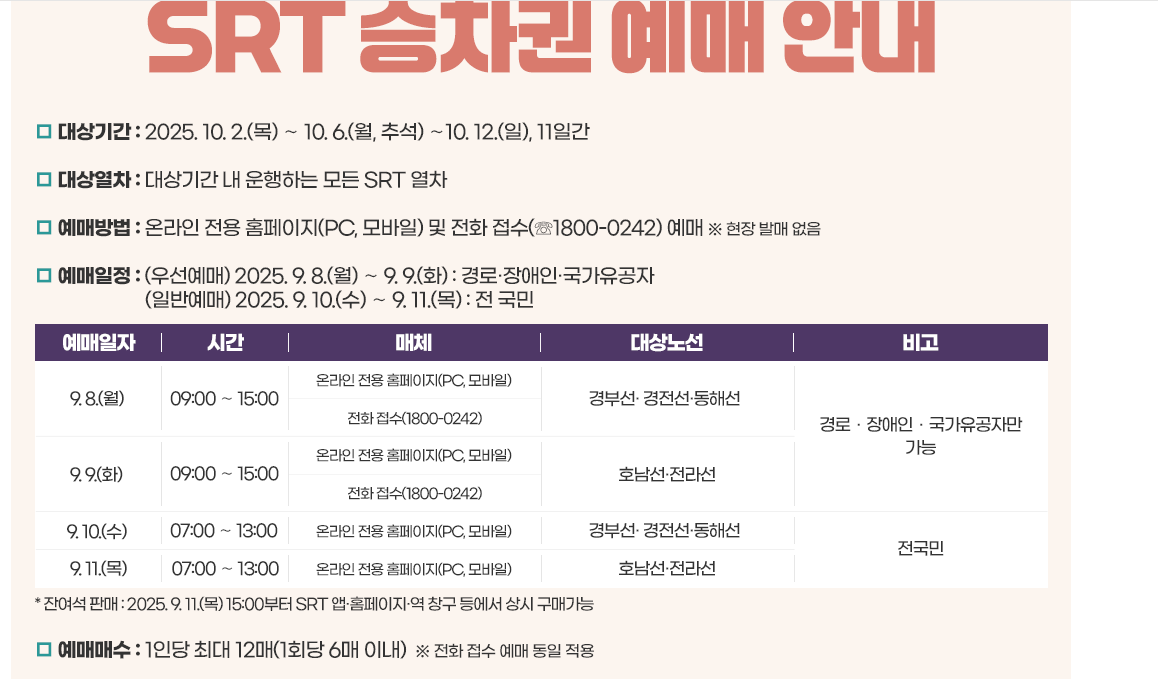 - 예매 방법: SRT 전용 홈페이지(PC·모바일), 전화(1800-0242)